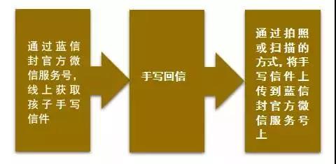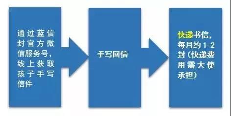 参与本次通信的孩子位于四川宜宾。为了优化孩子和大使之间的通信体验,蓝信封开发了互联网收发信平台- “蓝信封邮筒”官方微信服务号。通信大使将通过“蓝信封邮筒”获取孩子的信件,然后手写回信,根据所配对孩子的选择,把信件快递或者通过“蓝信封邮筒”发送给孩子。蓝信封将尽力确保个人隐私与信件保密。详细流程见下图: