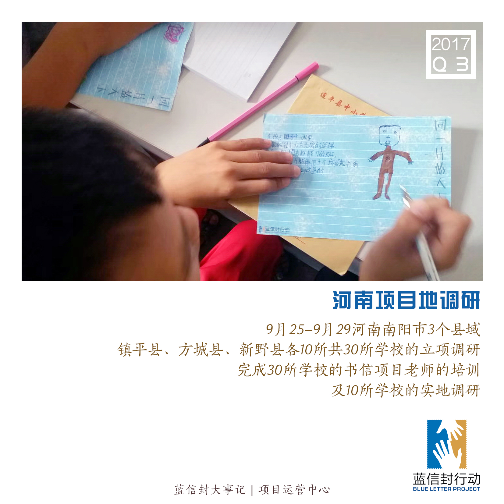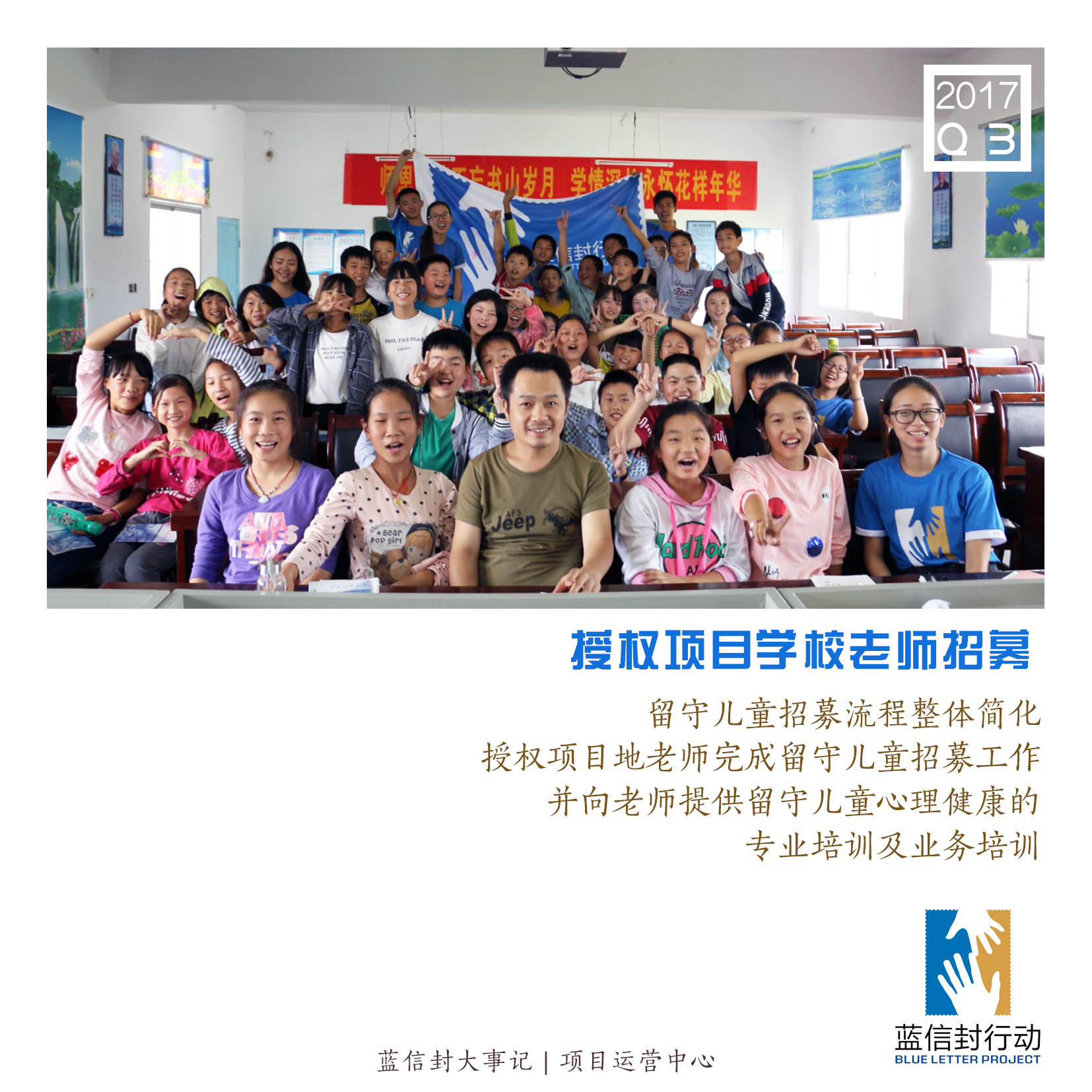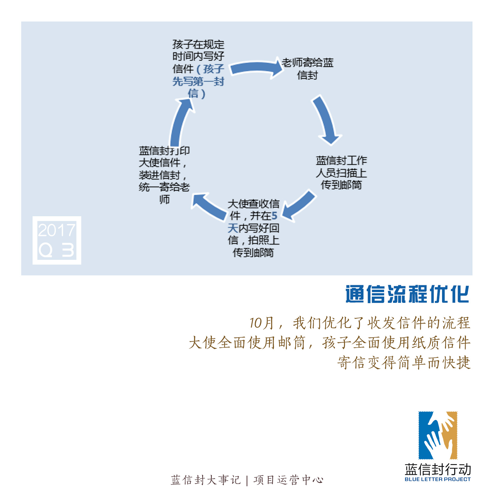 本季度蓝信封书信陪伴项目落地75所项目学校,覆盖6个省份。其中新增44所,包括自主申报有7所,合作招募有27所,其他方式10所。同时在项目地的在地工作上提升了学校关系维护的能力,另一方面是需求敏感的保持,在千姿百态的留守儿童和当地学校等因素的影响需更精准的回应需求。运营上,Q3前期综合大使的筛选比例、学校沟通和通信维护成本的3个因素进行了项目流程的优化,进而也提高了大使报名量的增幅;通过项目立项调研的流程及文书材料规范了学校项目申报,并且提供教师进行线下专业培训,优化教师管理流程。在项目设计流程规范化的操作设计,如招募大使缩短时差,智能化打印模式的书信质量的保证,在孩子招募方面,授权老师的根据孩子意愿筛选,逐渐提高收发信提高通信频率,制定标准规范化。