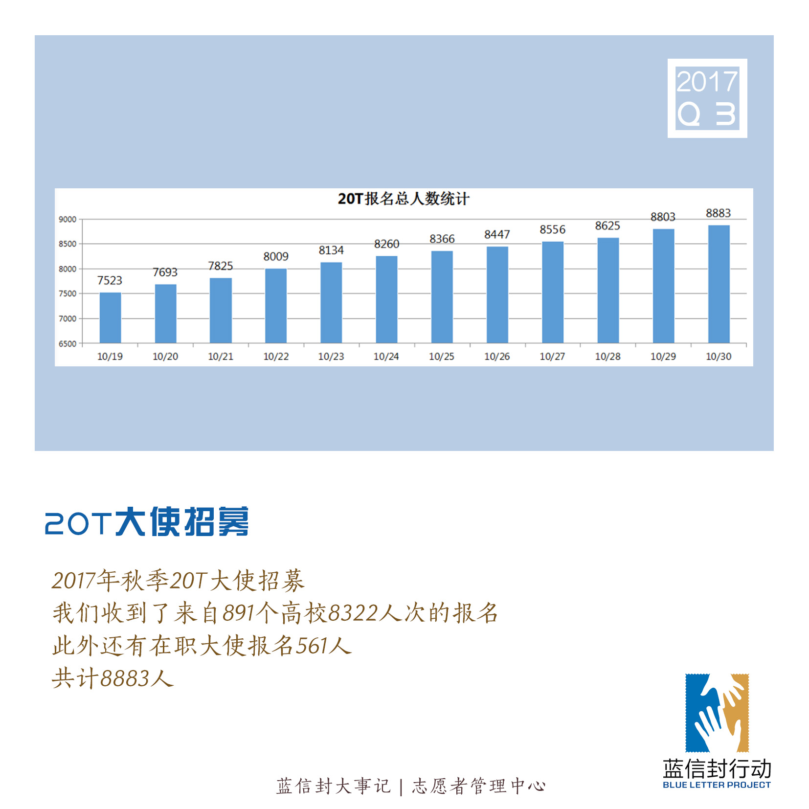 传播:20T招募以来,订阅号和服务号关注量大幅度的增长 ,当中更多的关注是志愿者基于项目的关联,还需通过多元化话题的拓展提高互动性;对公众号的风格定位和传播内容规划进行整合成了运营手册,进而规范传播工作管理;加大数据的分析。