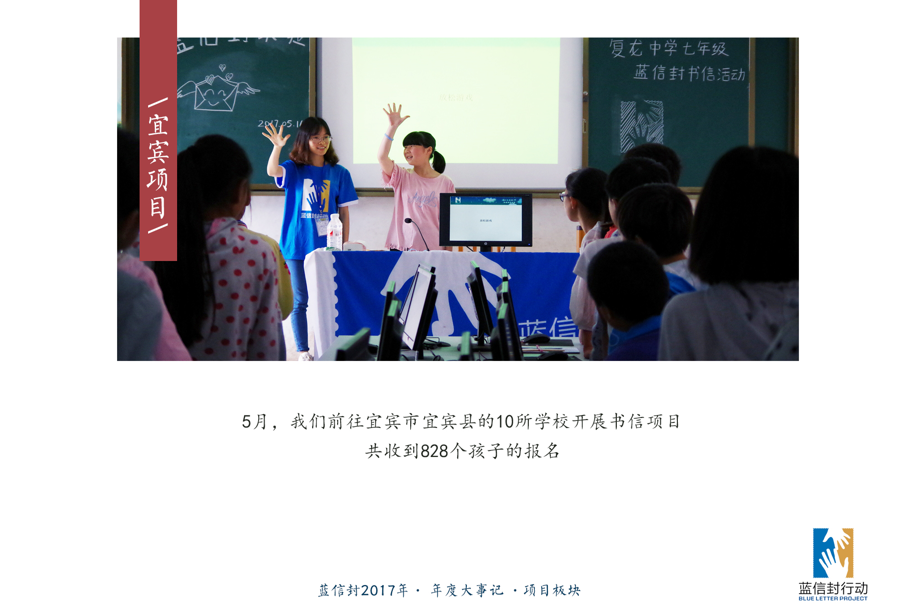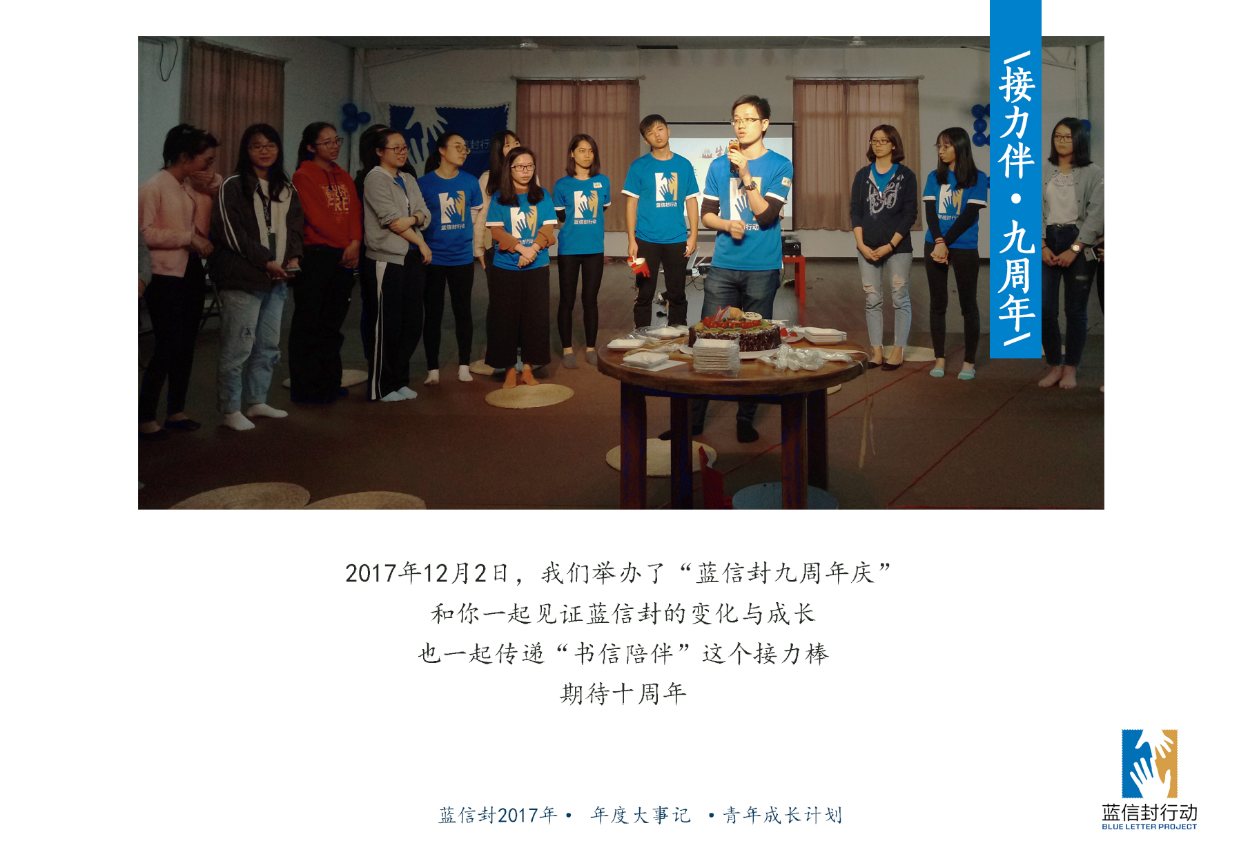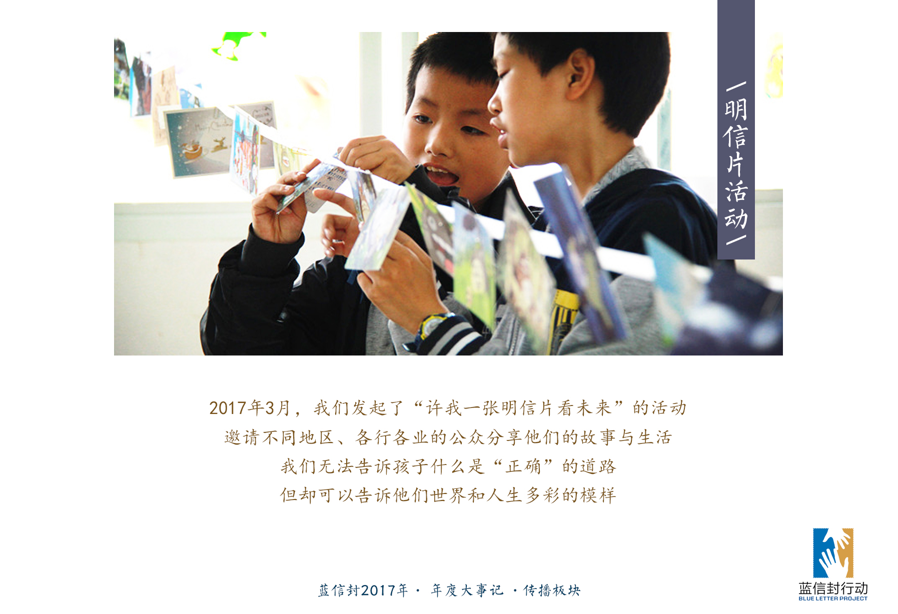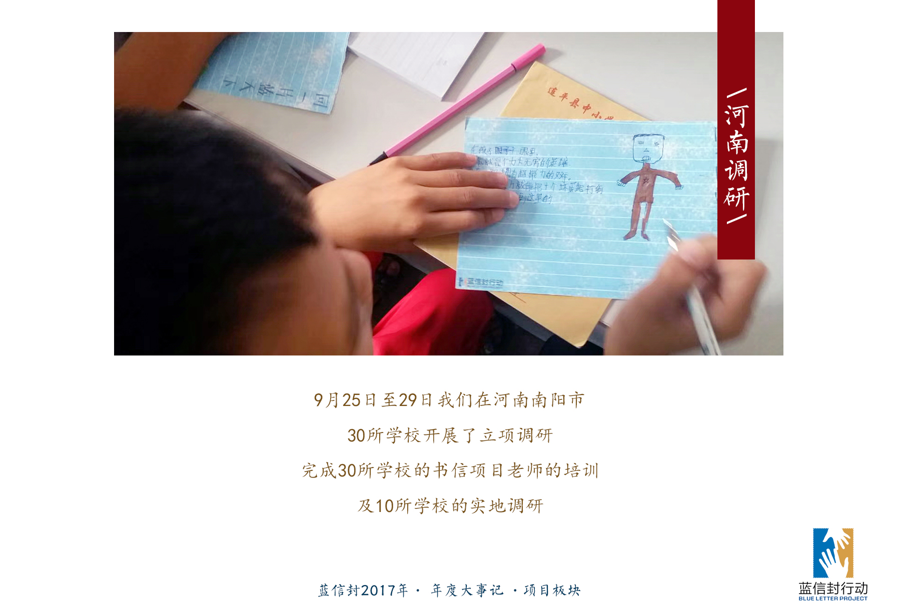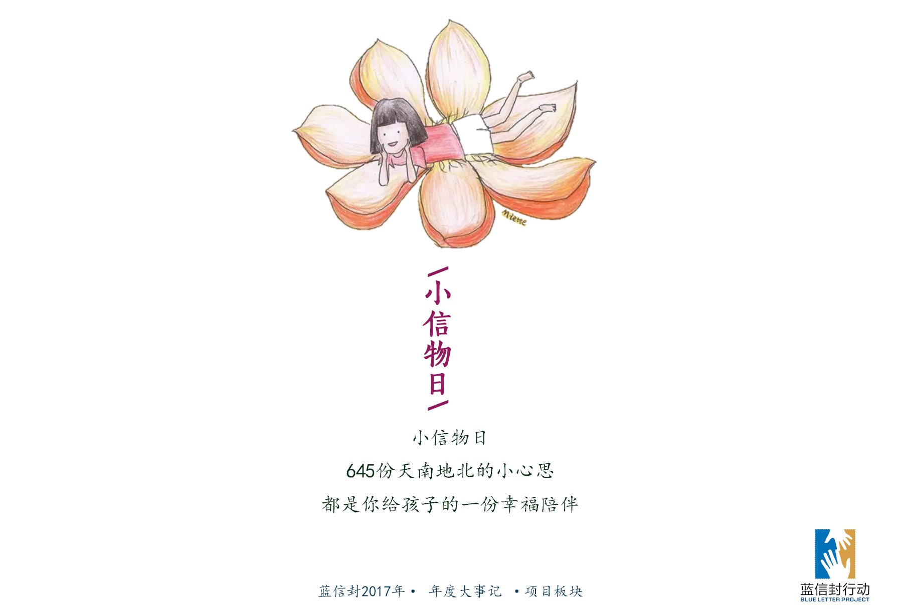 项目部总结:2017年已执行项目学校80所,覆盖6个省份, 审核申请10736份, 笔试信7642封。项目运营方面小信物日蓝信封一共有 645份礼物,649份心意送去到孩子身边。2017年大使与孩子的通信数量达到22528封。