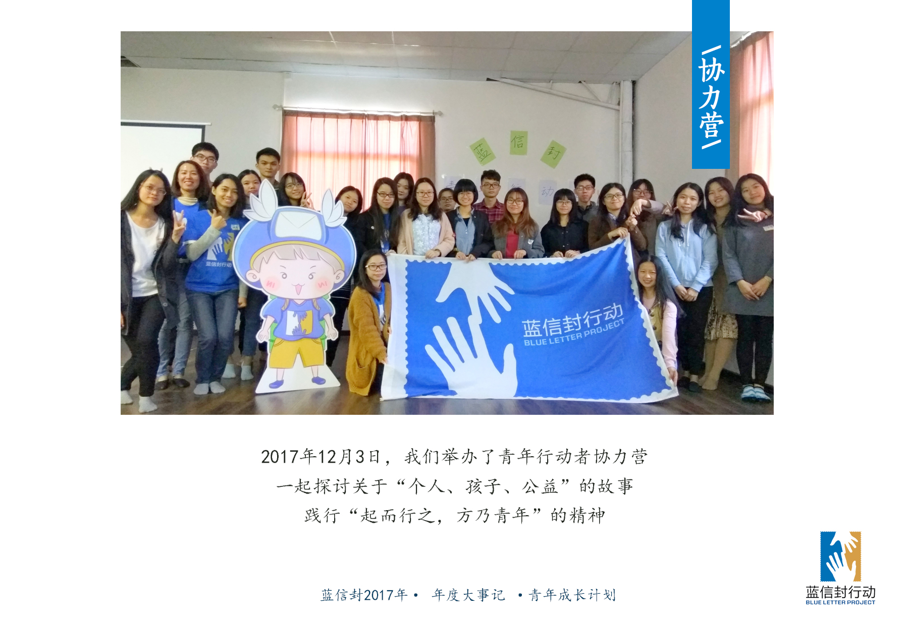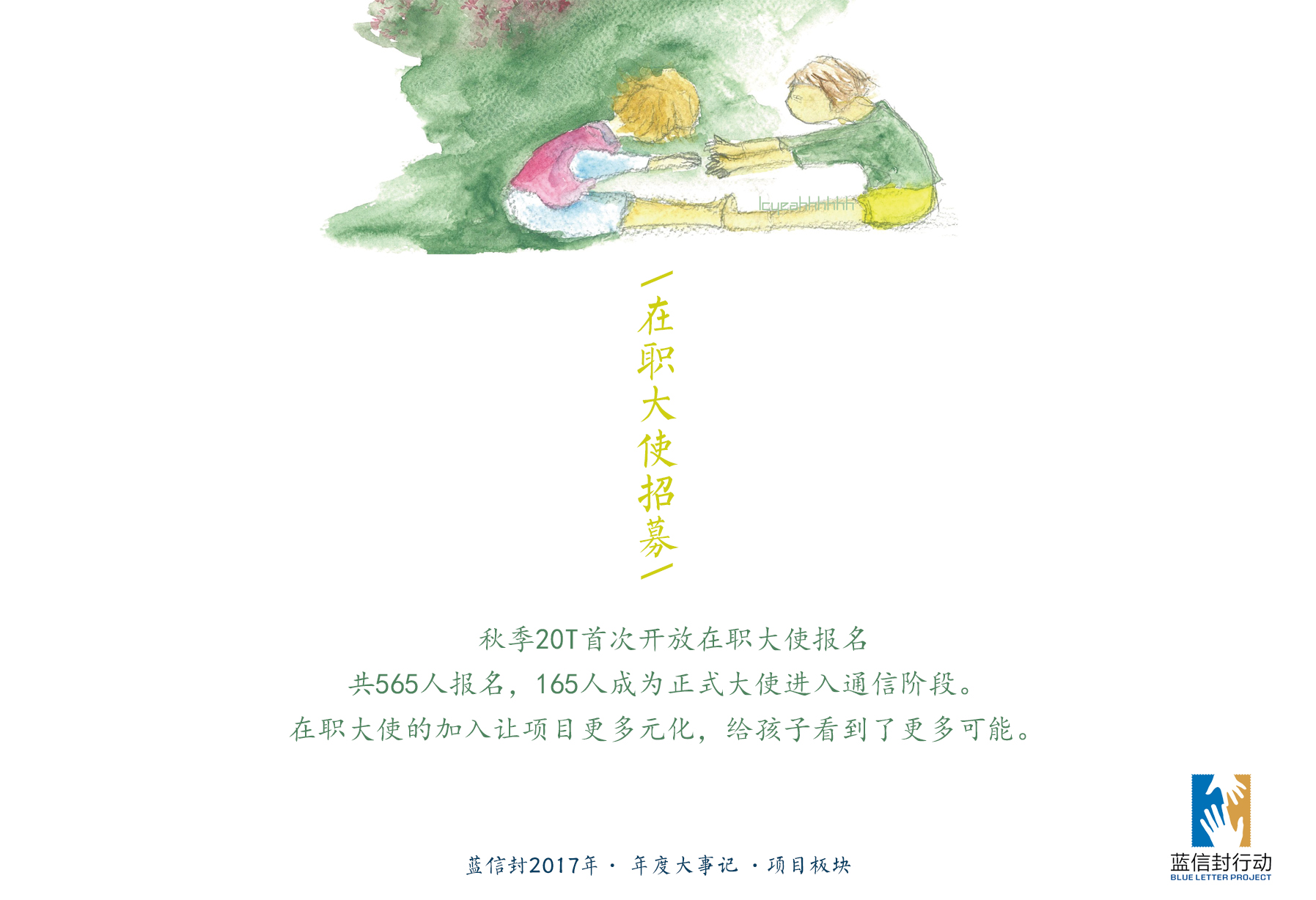志愿者部门总结:2017年度,蓝信封的召集人由1.0——104人覆盖78校区到到召集人2.0——245人覆盖195校区的突破,但是大使培训的报名比例、学习比例、反馈比例还较低,线上通信培训应该更加专业和多元。社群运营以广州线下为主,线上互动欠缺,还需提高志愿者的体验感。部门面临的挑战是大使数量与孩子数量的不均衡以及如何回应大批量的咨询。