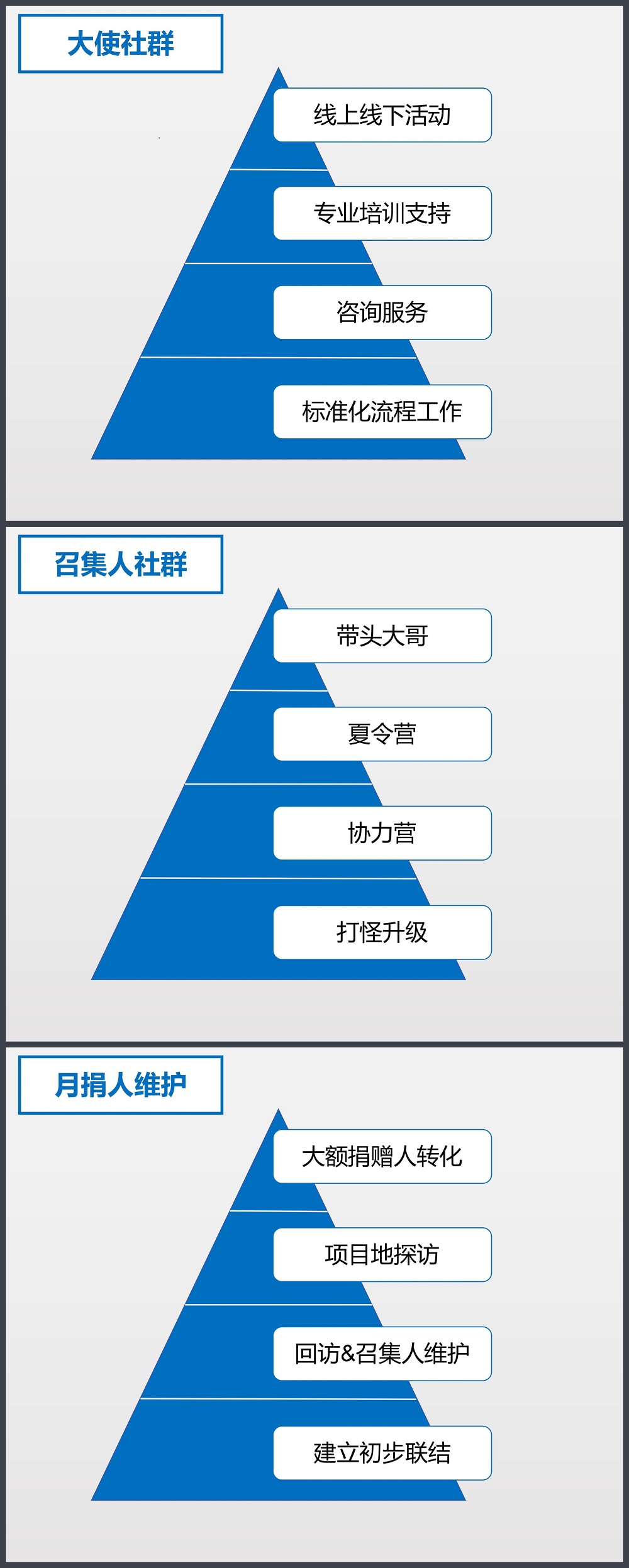 社群运营的小伙伴们在两天时间内针对通信大使、召集人和月捐人三方进行了工作梳理,并产出了相应的运营方案。