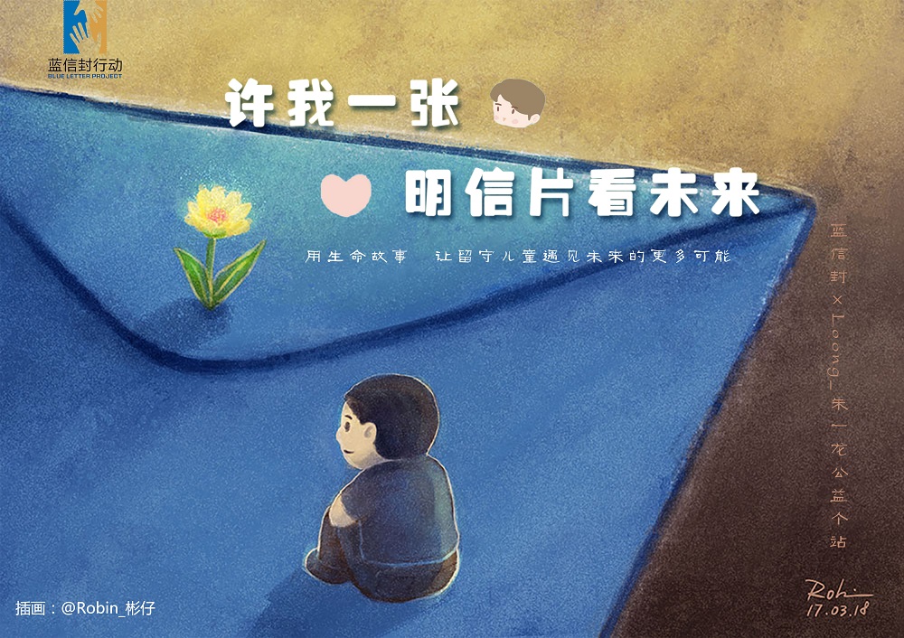 4月15日,蓝信封联合Loong_朱一龙公益个站开展了“许我一张明信片看未来”的活动。寄一张与生命故事相关的明信片,述说关于你的、你身边的一些影响你生命的微妙之事或者你生命当中那些重要的人,用生命故事的色彩弹奏未来,让更多的留守儿童看见人生的种种可能。