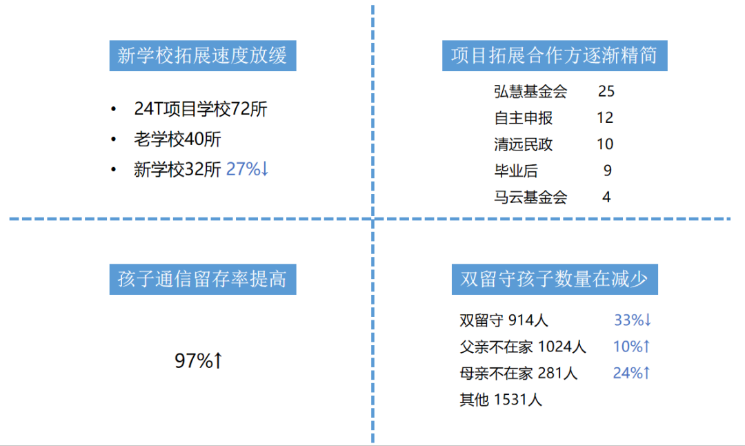 项目部Q4的主要工作是提高书信项目运营的效率和质量。项目团队放缓了新学校的拓展速度,逐渐精简项目拓展合作方;同时项目质量也有所提高,双留守孩子的数量在减少,孩子通信的留存率达到97%。