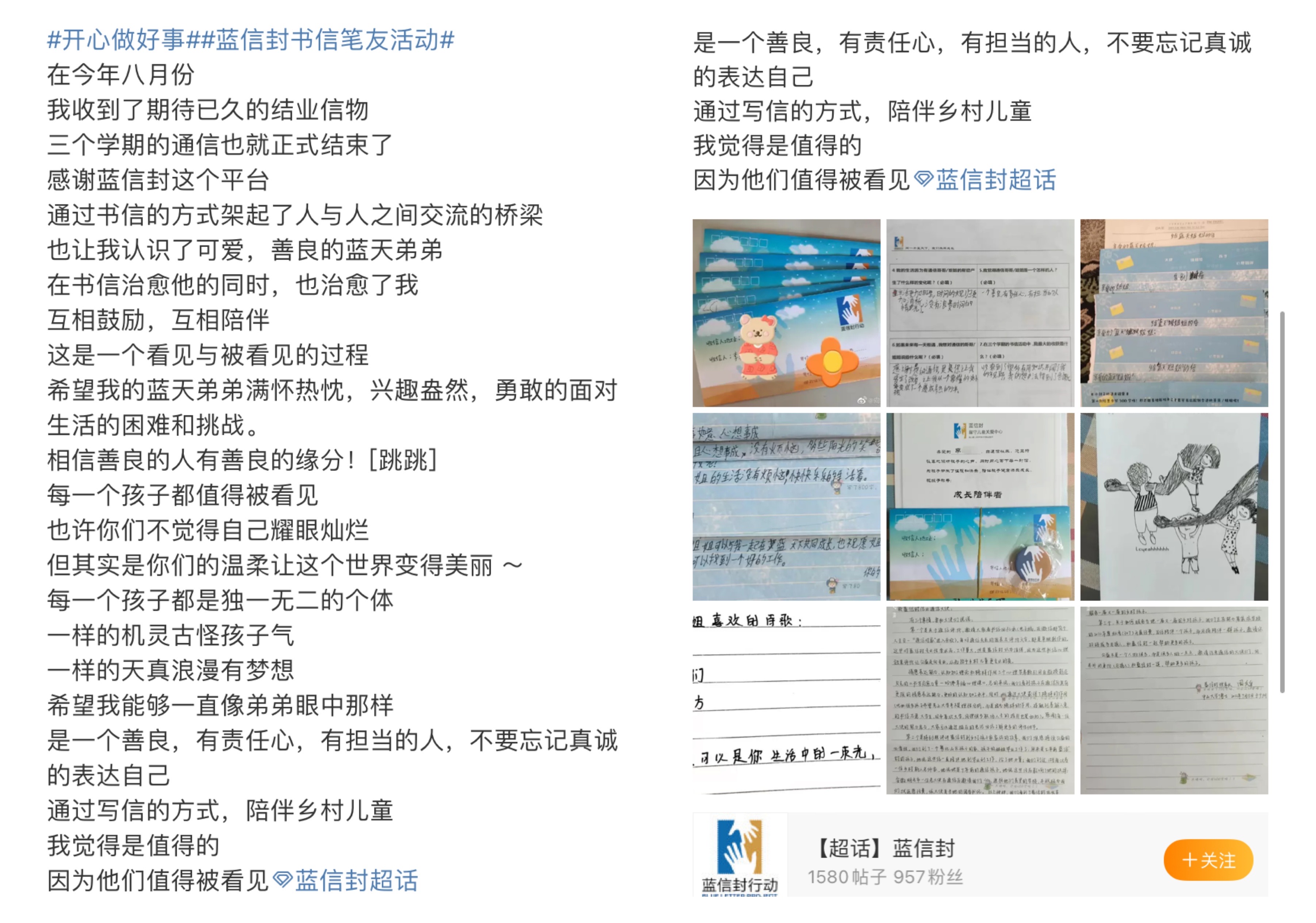 你们的真诚分享,将会让更多人关注到乡村儿童这个群体,共同加入书信陪伴行列!