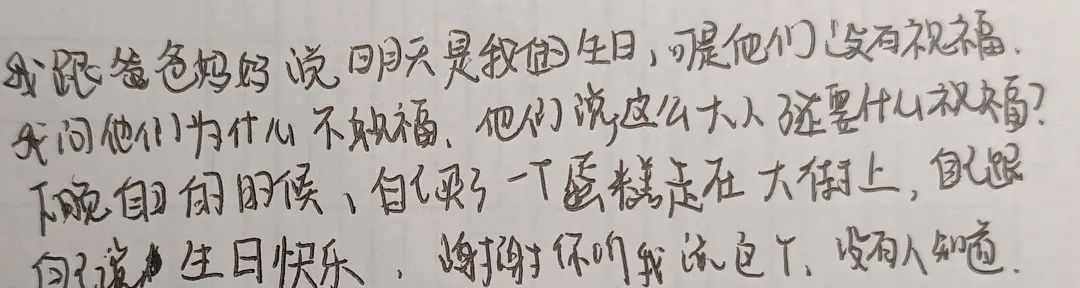 “下晚自习的时候,自己买了一个蛋糕走在大街上,自己跟自己说生日快乐。”