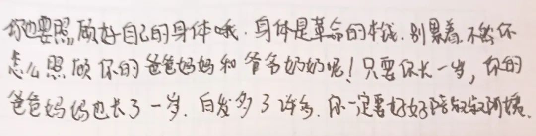 “你要好好照顾自己,才能好好照顾你的爸爸妈妈和爷爷奶奶。只要你长大一岁,爸爸妈妈也长了一岁,白发多了许多。要好好陪他们。”