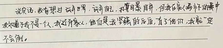 “说实话,我有想过放弃世界,放弃自己。但我在家人满怀的爱中,我知道了我不是一个人,我还有家人,他们是我坚强的后盾。”