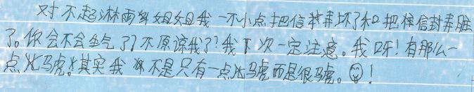 我的第二个通信对象,是个五年级的小妹妹,来自一个单亲家庭。她与弟弟很不一样的是,她似乎能够更快地向我敞开心扉。