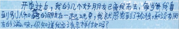但后来的几次通信,小鑫仍会继续向我倾诉新的烦恼;但也会告诉我说,我给他出的“宝典”让他学会了交新的朋友,让他不再孤独。