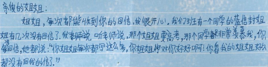 我想让这份关于写信的美好延续,也很想加入蓝信封这个大家庭,很想像我那位没有血缘关系的姐姐一样,去认识、帮助其他的孩子。