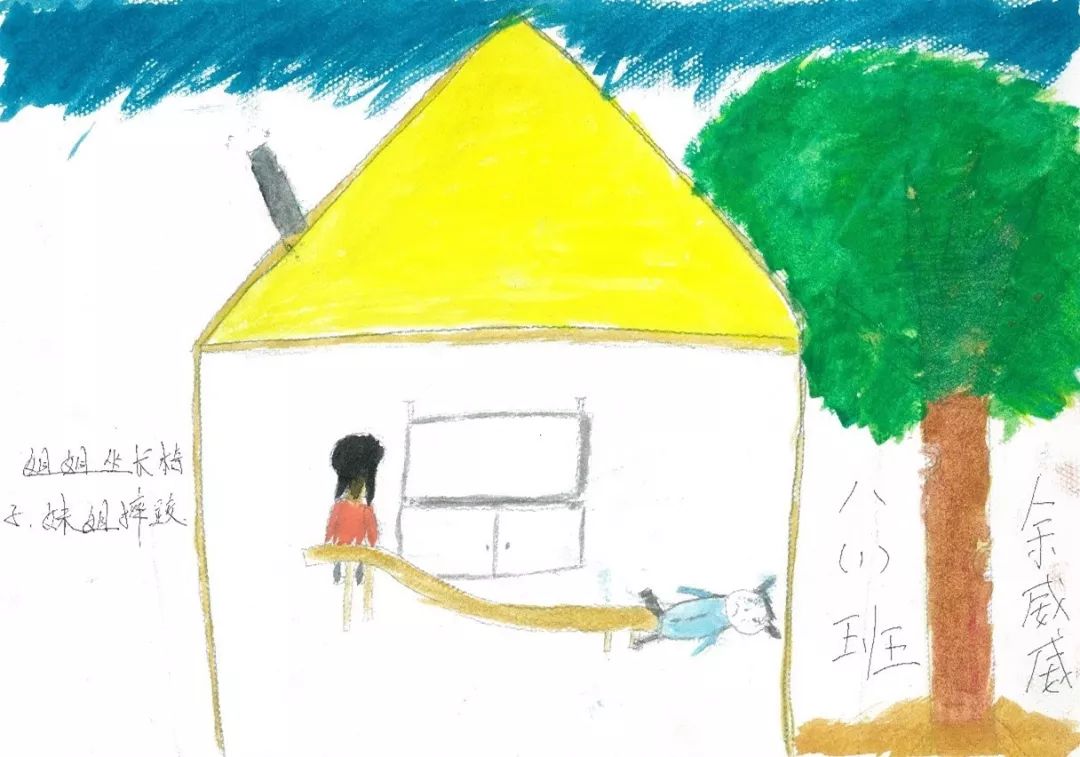 于是,最后的绘本中出现了调皮可爱的一刻,姐姐“捉弄”爱哭妹妹,让坐在椅子另一端的妹妹在“摔”了下来。