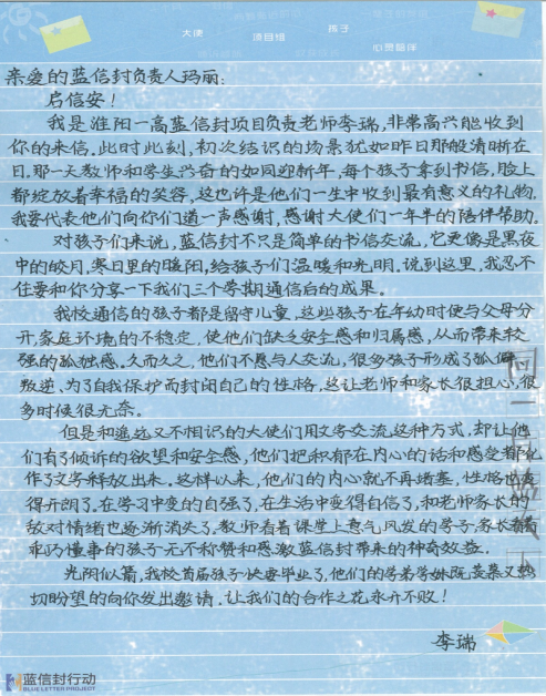 我叫李瑞,是淮阳一高初中二部的教务主任,因学校师资力量薄弱,同时也担任学校的心理老师,负责一千多名学生的心理教育工作。从2018年起我受聘成为蓝信封的项目老师,致力于确保我们学校79位孩子的通信顺畅。