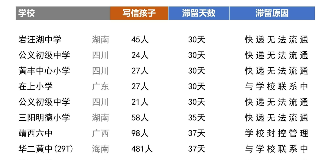 对于未回信的学校,当前蓝信封了解到各校的情况主要分为4类,分别是:①学校封控管理,②快递无法流通,③学校沟通困难,④与学校联系中。