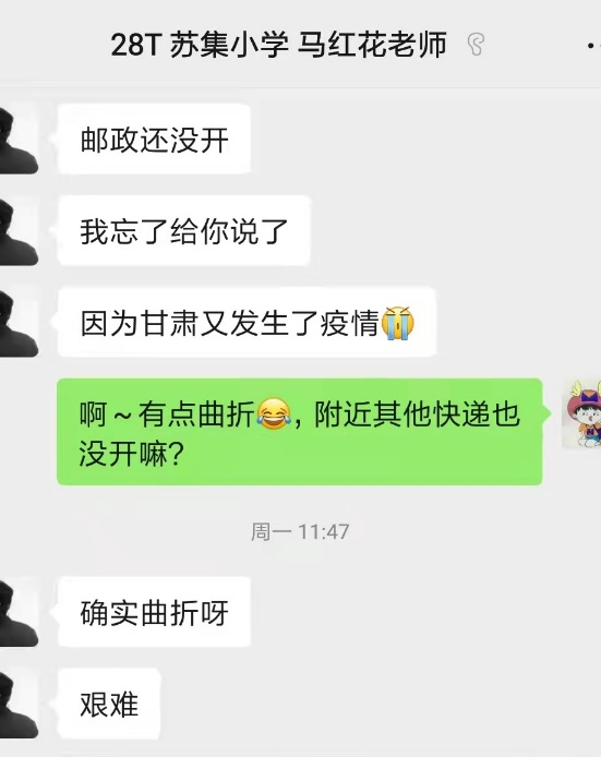 来自甘肃省苏集小学的马老师已经连续一个月联系快递点询问当地物流情况。马老师说孩子们早已写好了信件,但三月以来由于甘肃和广州(蓝信封办公室所在地)两地疫情反复,快递停发,孩子们的信件就只能先静静地在她家里等候着被寄出的日子。