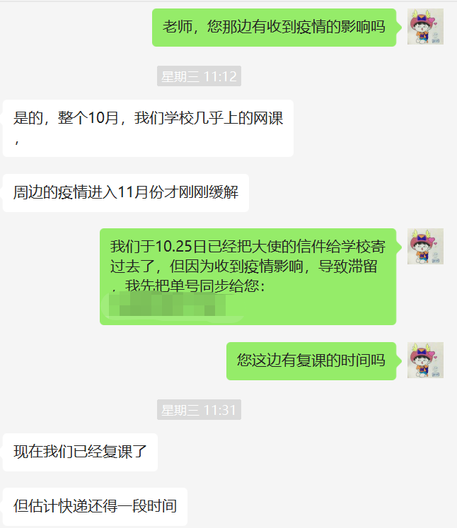 快递物流正常,但孩子因疫情严峻无法返校复课,也无法收到通信大使的信件以及回信。
