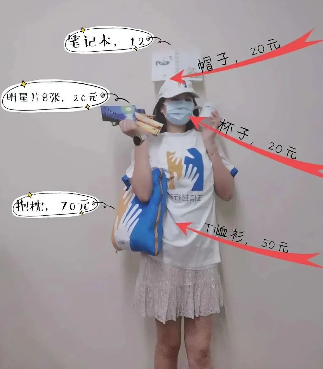 马克杯56个、抱枕3个、帽子7个、孩子画作明信片1套、笔记本4本、文化衫8件,手写诗歌明信片N张,共筹款3768元……