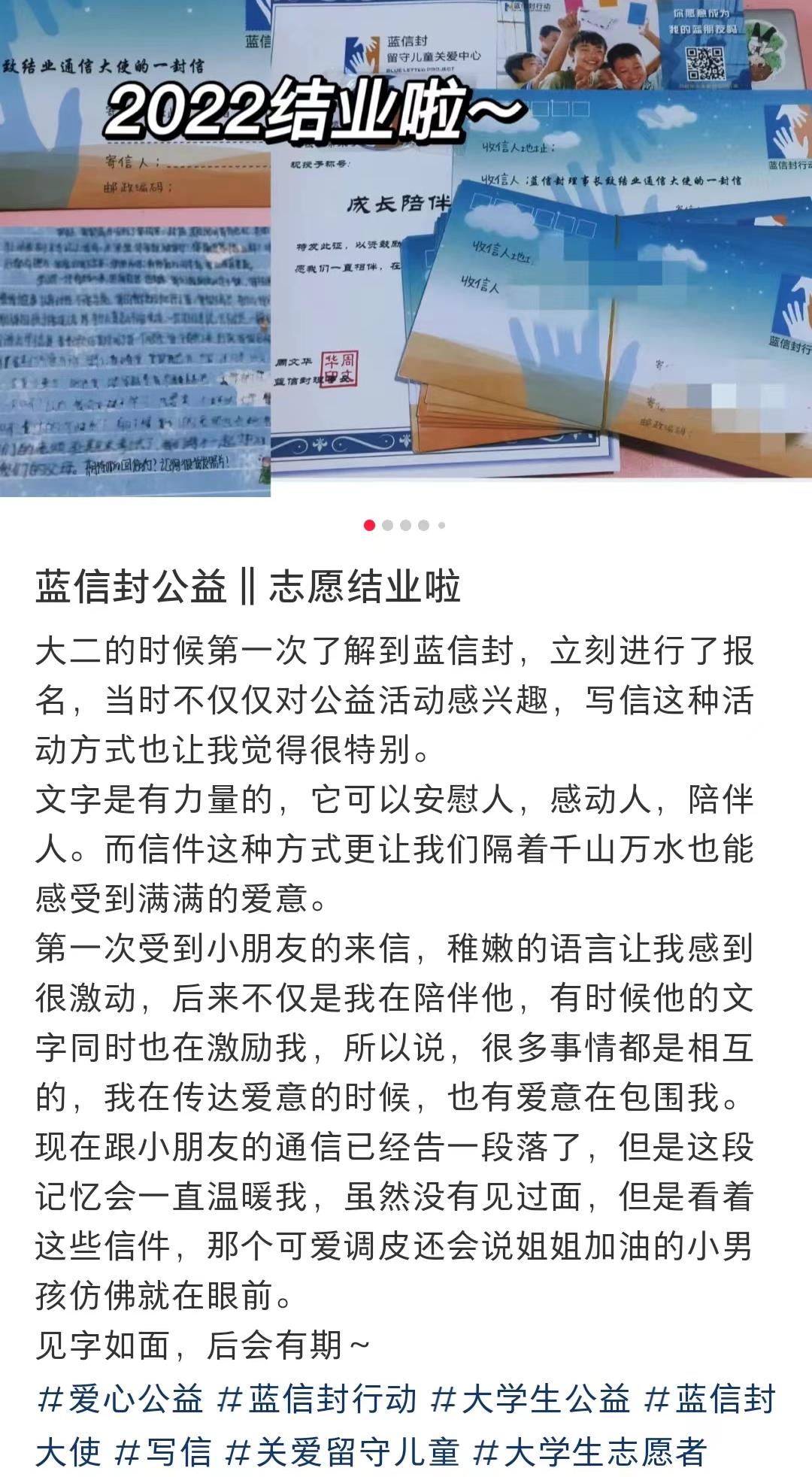 做召集人结业视频的时候,我讲着这段在蓝信封的故事,讲着讲着不由得想哭,感动于这段时间与其他召集人在社群内的经验互享、联动交流;还有我自己在招募通信大使过程中遇到的志同道合的伙伴们;更有蓝信封给予的支持、建议与安慰……这些人和事都会让我感受到,我们在为了同一个愿望去努力发出自己的一份光和热。