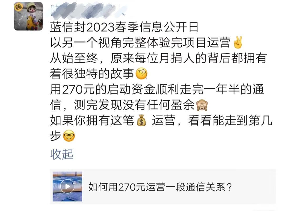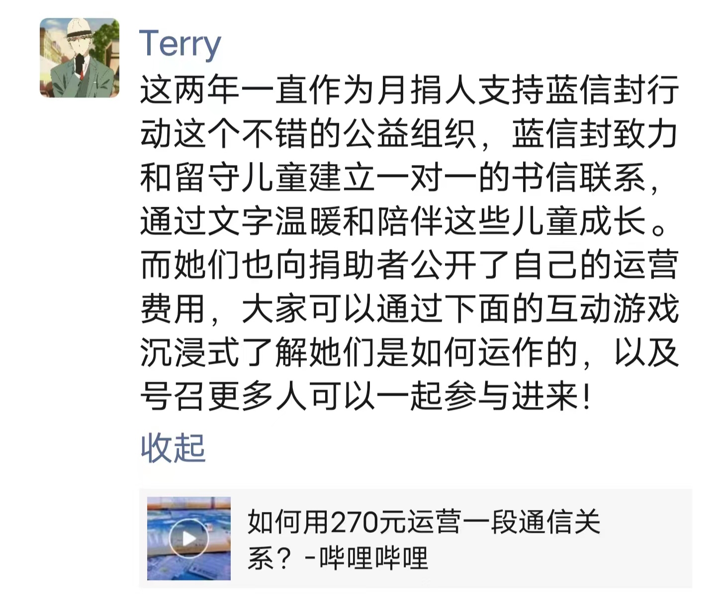 蓝信封月捐人既是书信项目的支持者也是监督者,为了让大家更全面了解善款流向,我们通过【用270元走完一年半】互动视频清晰解释了每个运营流程的项目成本。欢迎点击下方按钮或阅读原文体验互动视频。