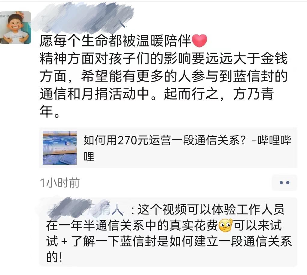 通过清晰有趣的互动视频,月捐人们也更理解了蓝信封书信项目的资金流向,并表达了2023年将持续关注项目月报、积极参与月捐人活动、始终监督项目执行成效的决心。这也是蓝信封开展信息公开日的初衷:培养理性捐赠人,坚守价值。