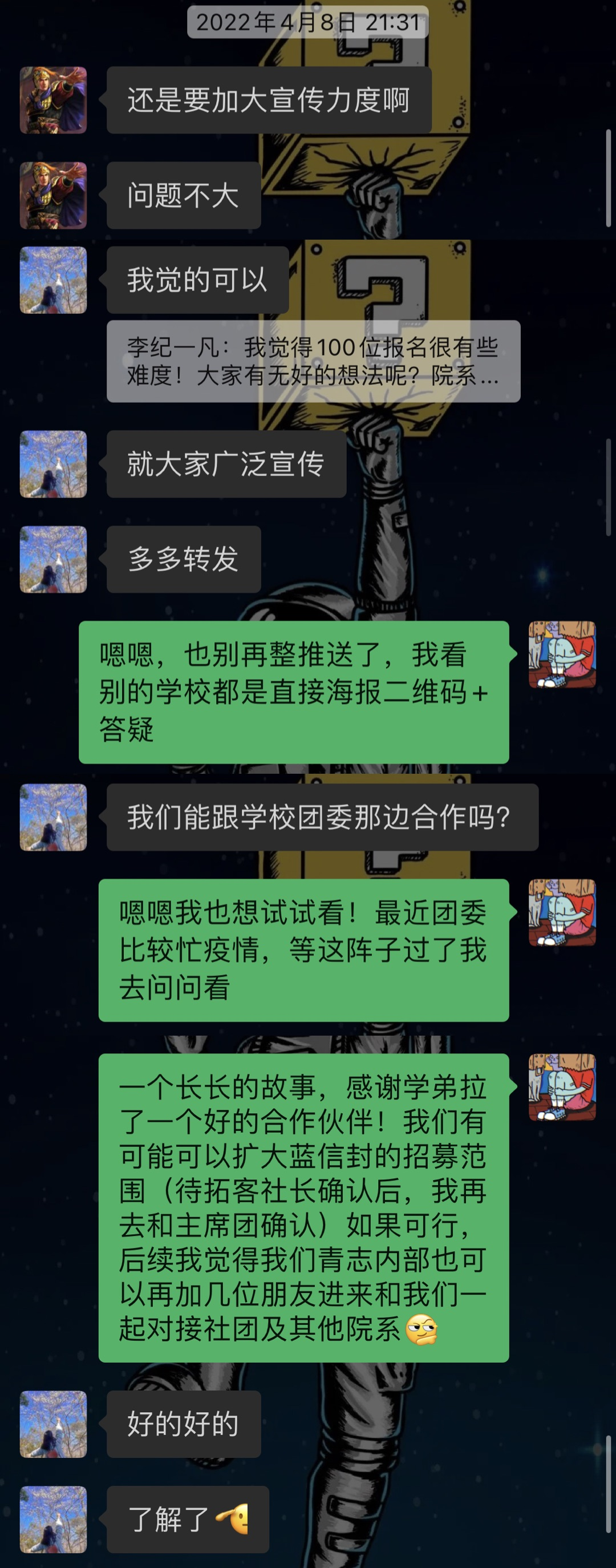 于是在与蓝信封负责高校召集人工作的全职以及学工部老师沟通后,我们选择了院系/社团联动的方式,以扩大招募范围至全校。与我们合作的复旦大学拓客科技教育协会负责人是一位负责、热心且耐心的学妹,她所在的平台传播面更广,为大使招募贡献了新的力量。