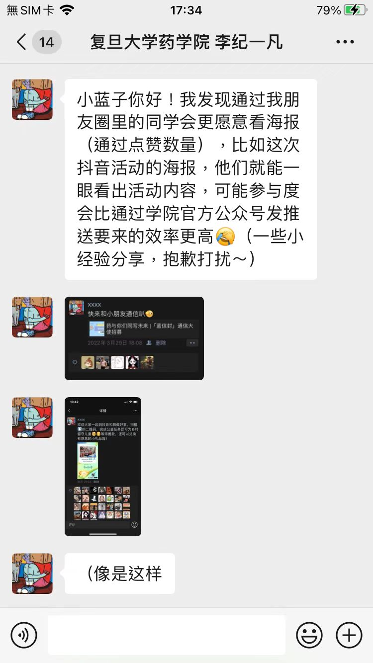 但是在第一篇“药与你同写未来”报名推送发出后,报名人数只是算差强人意。在招募过程中,我了解到各校的招募策略差异还是很大的,一些宣传方式并不适用于我所在的学校。坦白而言,面对蓝信封对高校召集人的考核标准,和其他学校同学们的热烈响应,我有些焦虑和颓然。