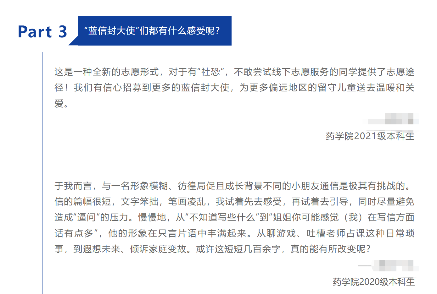 我不是由热情驱动以至于为公益孤注一掷的人,更多的是把服务做好的较真,或者说是责任感,这个过程中与被服务者的情感交换,大约是最“不理性”的部分,而正是这种“不理性”,助燃了我一次次加入公益的冲动。在遇到蓝信封之前,我作为院系青年志愿部的成员,已经参与过很多志愿活动了。