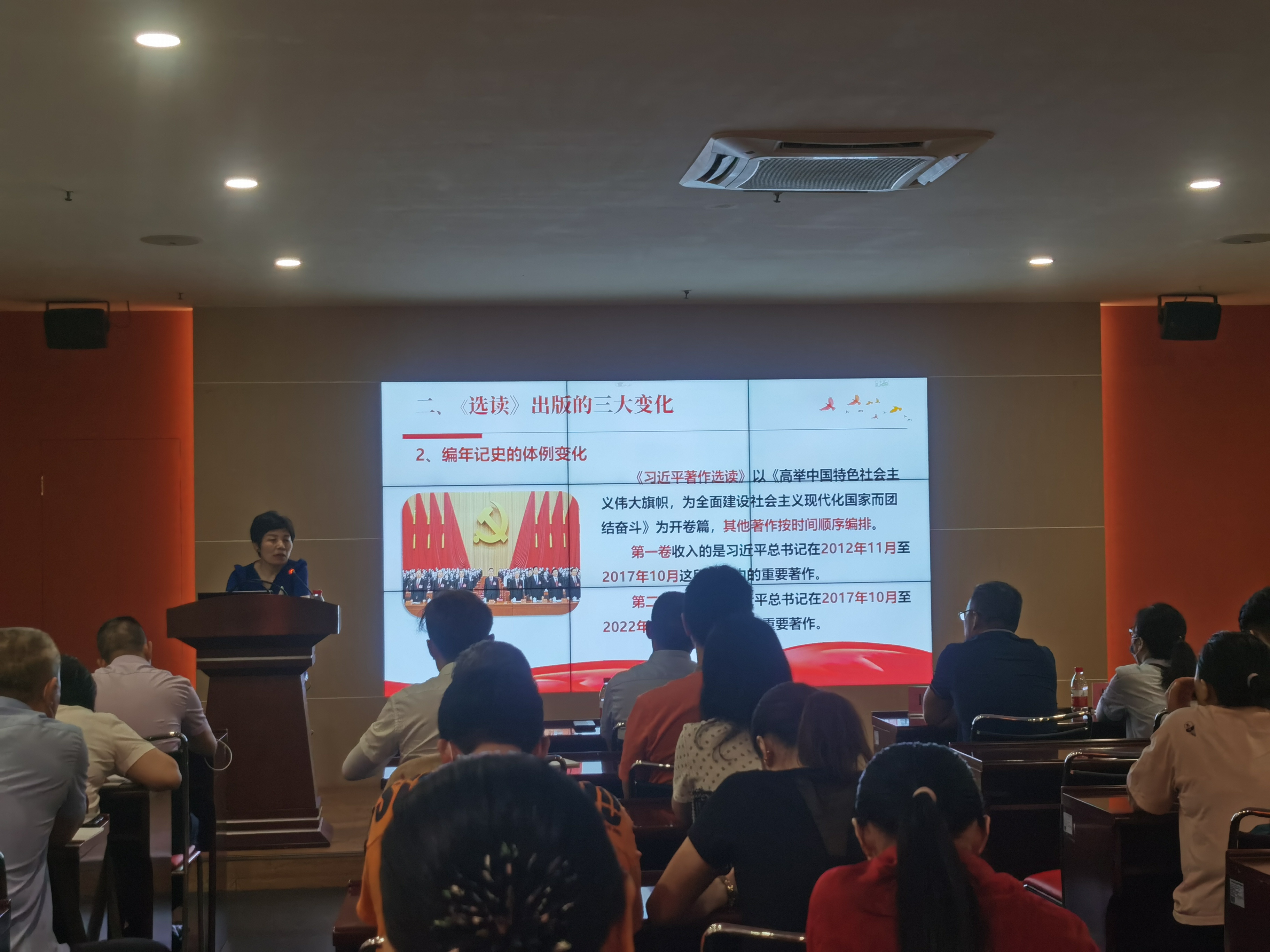 然后由解教授讲解了《习近平著作选读》第一卷、第二卷专题党课。解教授从多个模块角度生动讲述该著作的内容与思考方向,并结合自身感受补充著作难理解的地方,讲述了著作的由来及与其他著作的不同。