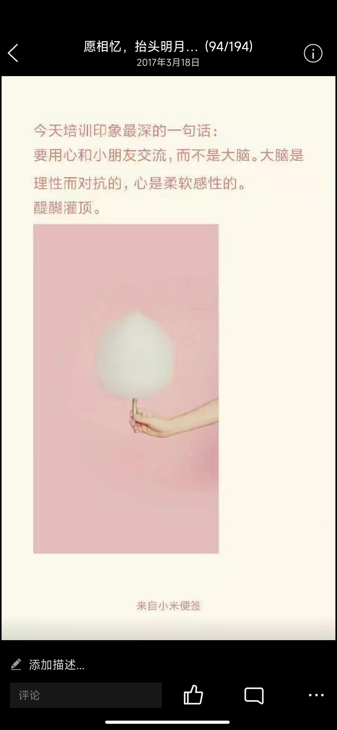 “要用心和小朋友交流,而不是大脑。大脑是理性而对抗的,心是柔软感性的。”这句话不光解决了当时的我内心的困惑,更是我之后与人沟通交流的信条。