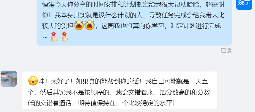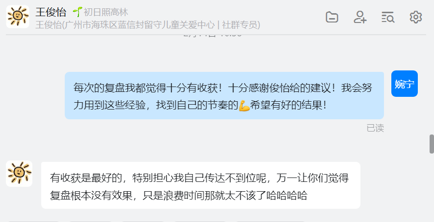 小组负责人及时细致的反馈和沟通,全职伙伴的支持和鼓励,实习生“队友”的经验分享和相互间打气,我身处于一个热气腾腾的、充满能量的大家庭中;每一通电话的拨打,每一封信件的审核,都能够被看到,每一秒投入到工作中的时间,都有迹可循。我又好像站在领奖台上,聚光灯打在身上,我的“努力”能被自己看到,我忍不住为自己鼓掌。