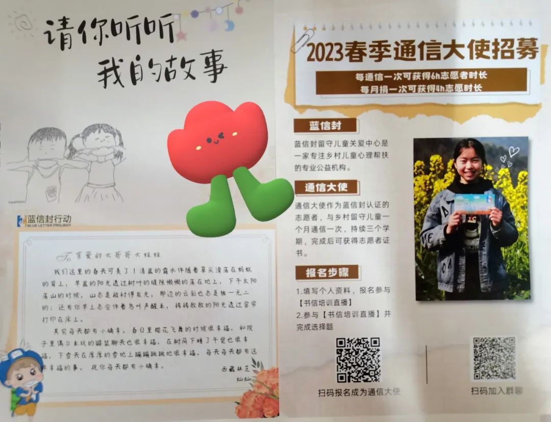 在活动开展前的一个月,我一直在思考如何有效地开展招募活动。我需要考虑招募所需的材料,哪些传播途径更有效,以及招募内容的设计。每一个环节都需要我深思熟虑,因为这关乎到我们能否成功招募到足够多的通信大使。我想让蓝信封被更多人认识,哪怕可能只是被短暂地关注了一下,我也希望他们接触这个活动,因为每一份关注,都可能为我们的活动带来一份潜在的宣传力量。
