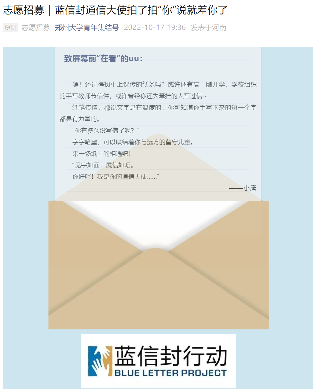 恰巧看见有人的朋友圈发布了一个关于蓝信封的推文,又恰巧那个时候是咱的秋季召集人招募,我就去咨询了一些学长学姐,报名了这个活动。