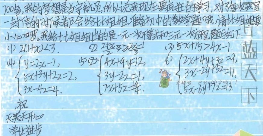 于是经过三轮考核我成为了通信大使。蓝信封给我配对的是一位七年级的弟弟,我和弟弟每月一次通信中都会分享近期生活有趣的事情,特别有意思的是弟弟知道我数学不好之后,每次通信就会在最后给我出数学题,下一次来信弟弟还会“批改”我写下的答案。每月一次通信都让我对这个月有所期待,正如《小王子》中说到:“如果你说你在下午四点来,从三点钟开始,我就开始感觉很快乐,时间越临近,我就越来越感到快乐。”