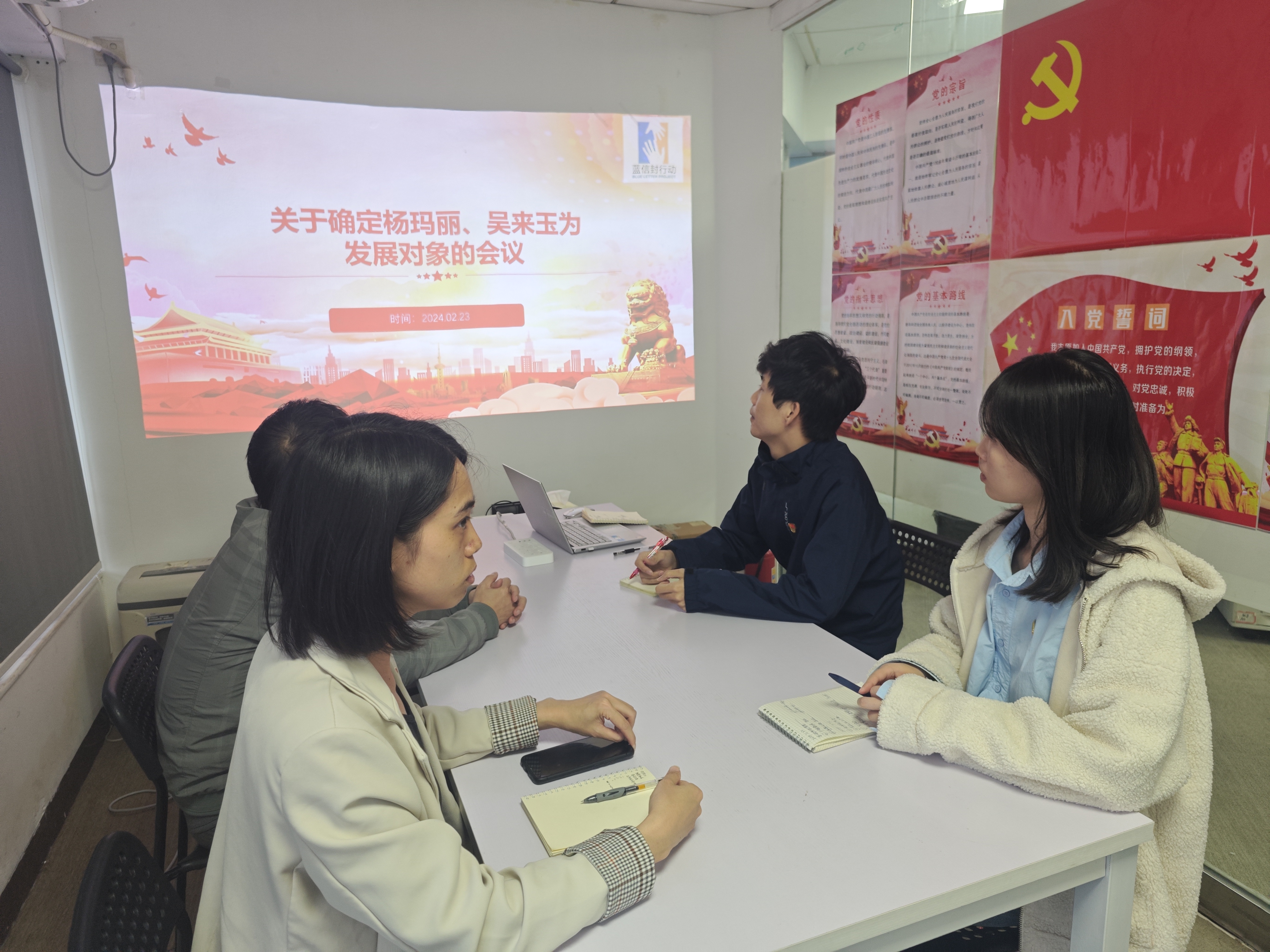 2024年2月23日,蓝信封党支部举行党员大会,关于确定杨玛丽、吴来玉为发展对象进行讨论研究。