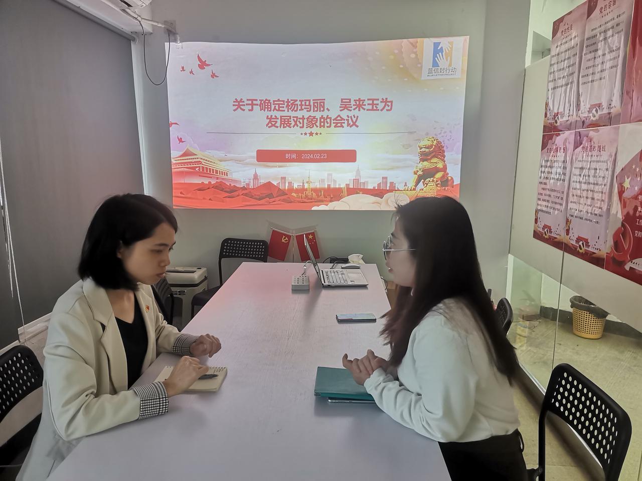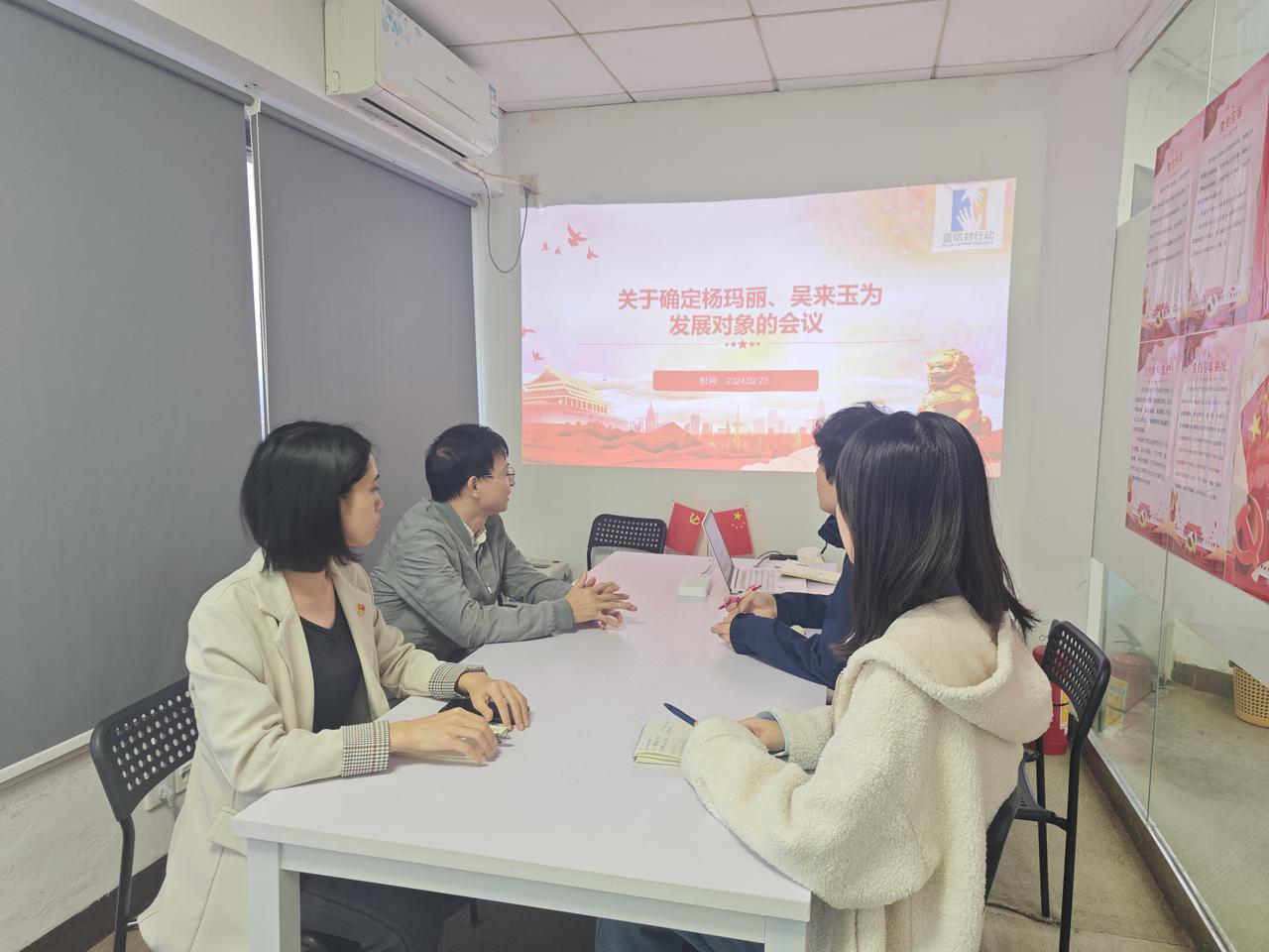 2024年2月23日,蓝信封党支部举行党员大会,关于确定杨玛丽、吴来玉为发展对象进行讨论研究。