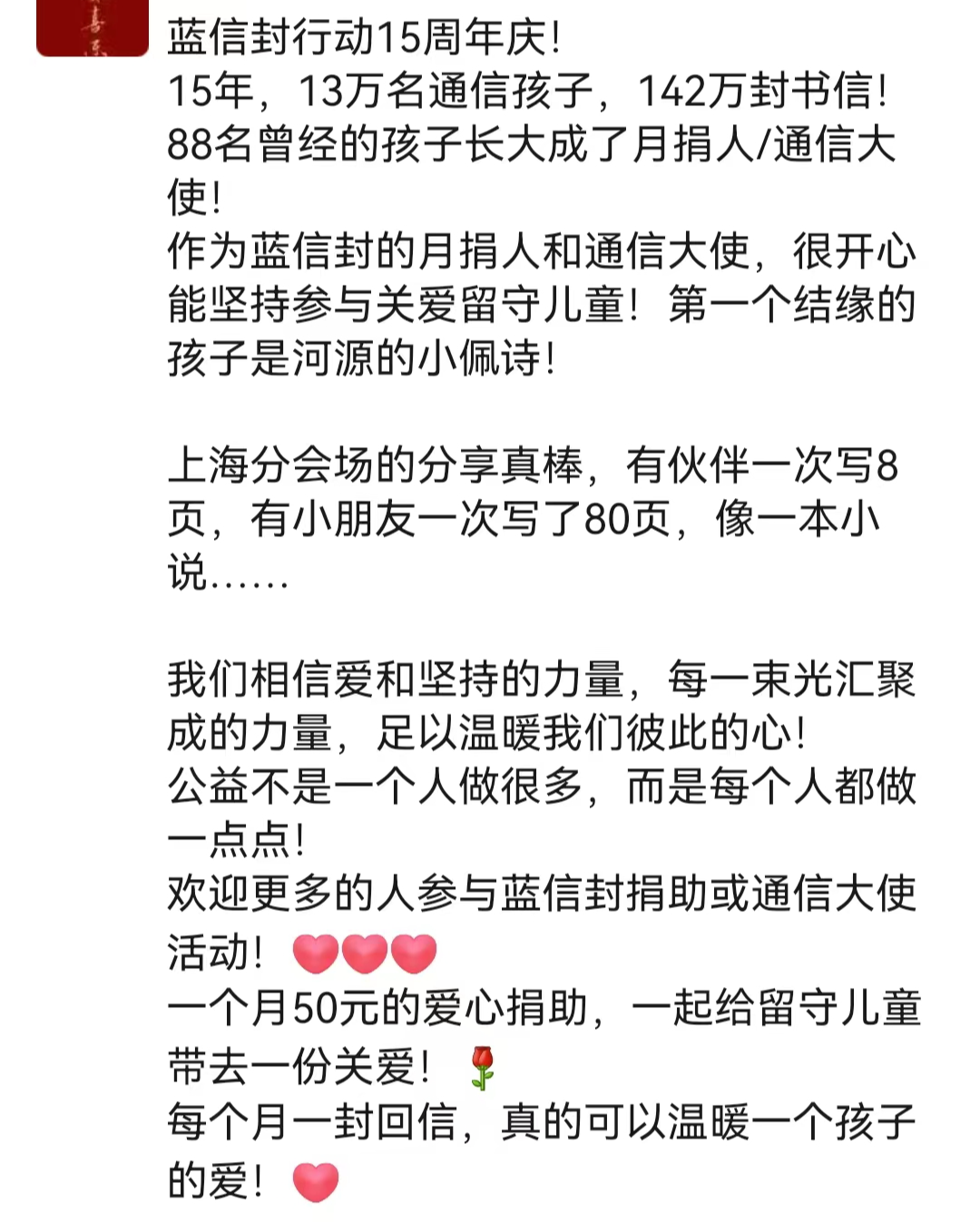 十五年来,蓝信封一直坚持信息公开,坚守价值。