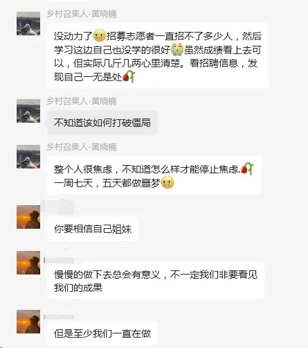 老师也给了我一些鼓励和建议,但我感觉自己的力量还是太单薄了。一个人在线上的的“单打独斗”让我开始怀疑做这些事情的意义,是否真的能够帮助到别人?我像是在做一场感动自己的梦,掉进了自己的理想漩涡中。