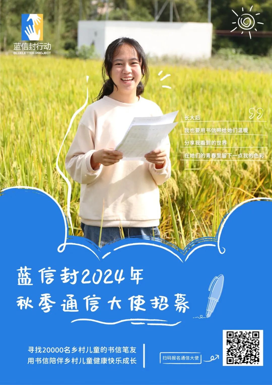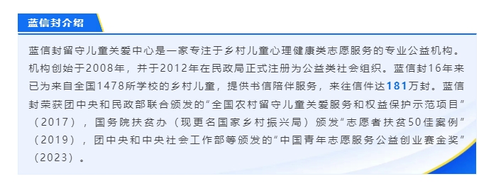 蓝信封邀请你成为通信大使,将书信的陪伴力量传递给更多乡村儿童,也让自己拥有被陪伴、倾诉的机会。